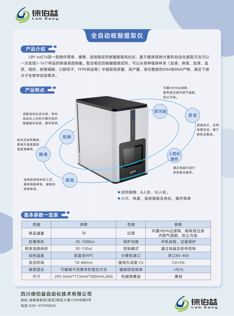 LBY-ezE16是一款操作简单、便携、高效稳定的核酸提取纯化仪,基于磁珠吸附分离的自动化提取方法可以一次实现1-16个样品的快速高效制备。配合相应的核酸提取试剂,可以从各种临床样本(血液、体液、血清、血浆、组织、脱落细胞、口腔拭子、FFPE样品等)中提取高质量、高产量、高完整度的DNA和RNA产物,满足下游分子生物学实验需求。
